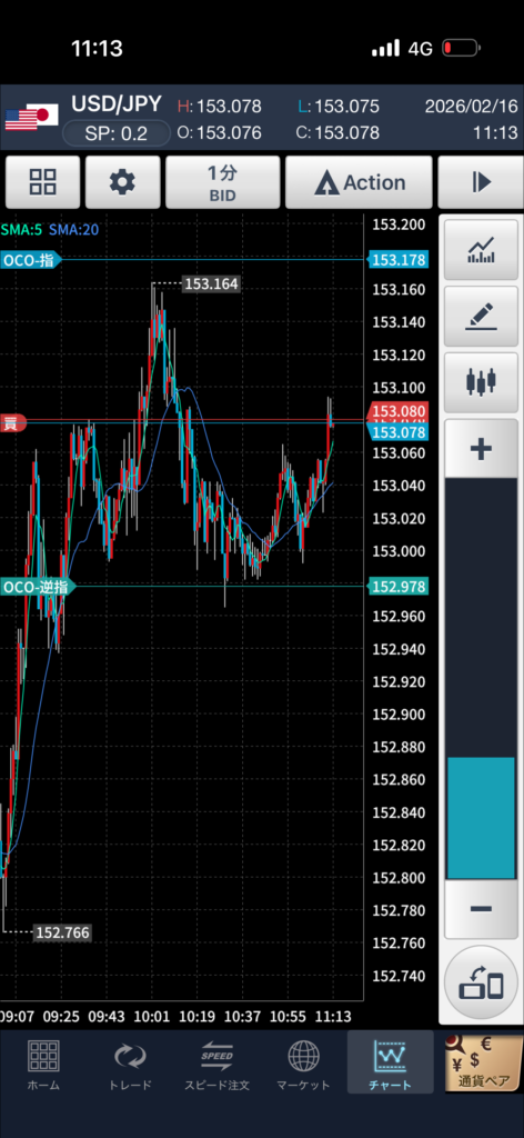 今朝のトレードと似た形だったため、上抜け継続を狙う展開と判断。