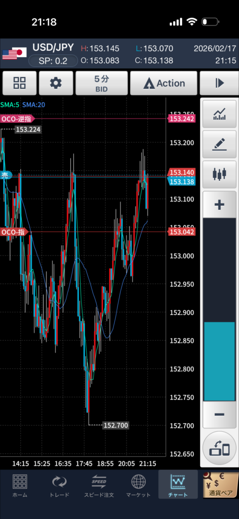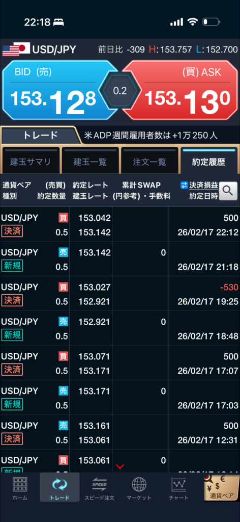 2026.02.17 USD/JPY +500円 トレード記録 2026.02.18 目次 環境認識エントリー根拠決済改善点 環境認識 5分足ベース。 直近高値付近まで戻した後、上値が重くなり失速気味。 一度高値を試したが抜けきれず、再度売りが入り始めていた。 高値圏での反落を想定。 エントリー根拠 直近高値付近まで戻した後の陰転気配。 上昇の勢いが弱まったと判断しショート。 RR1:1、OCO設定で機械的に管理。 決済 利確到達。 +10pips(+500円) シナリオ通りの値幅。 改善点 ・高値圏での「抜けない確認」をもう一段明確にできたか ・上位足の流れとの整合を今後さらに精査