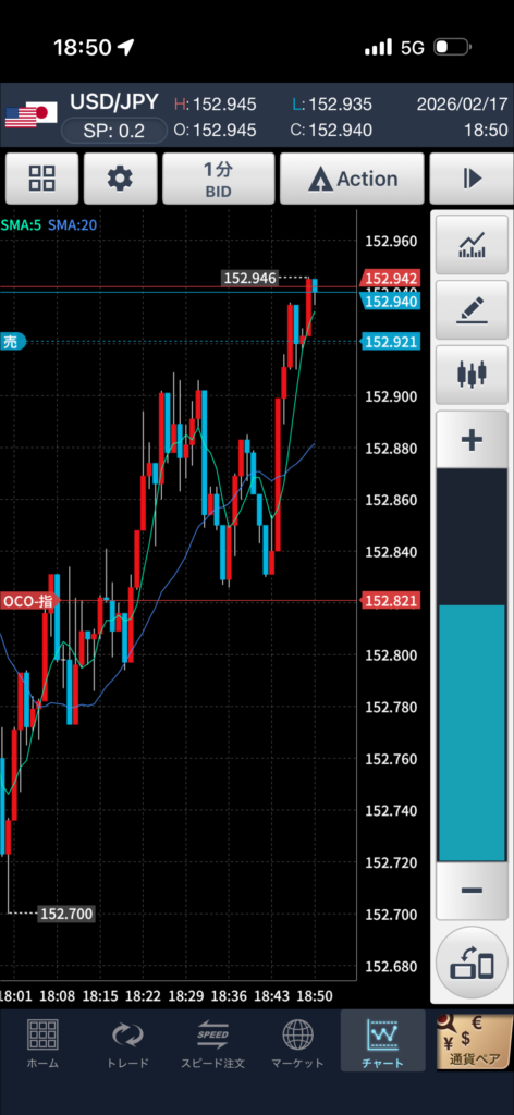 ただし、直近は強い反発が入り、1分足では陽線が連続している状態だった。