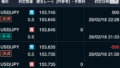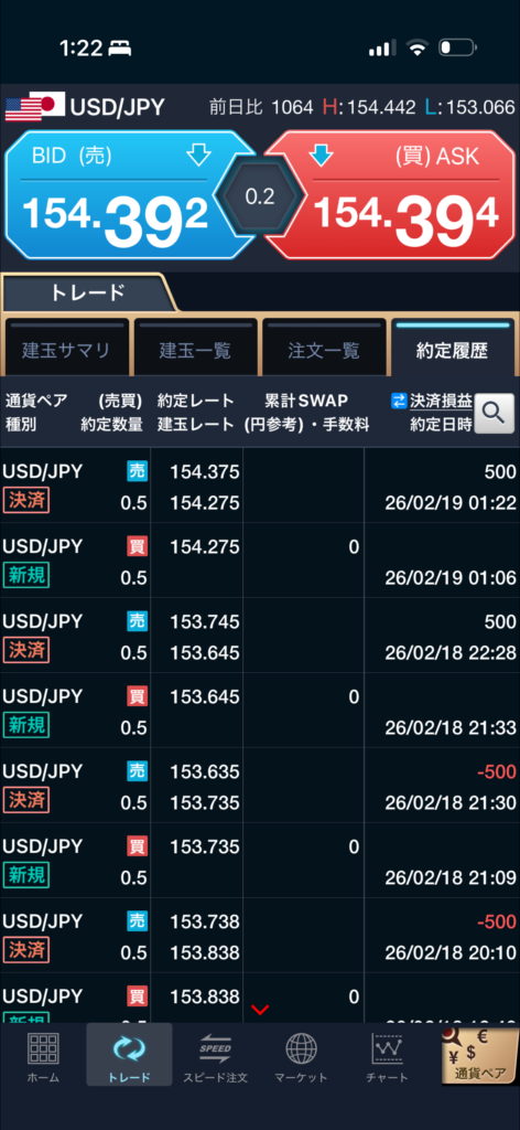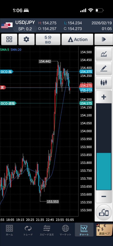短期的に強い上昇トレンドを形成していたが、154.400前後で上値が重く、もみ合いに移行。